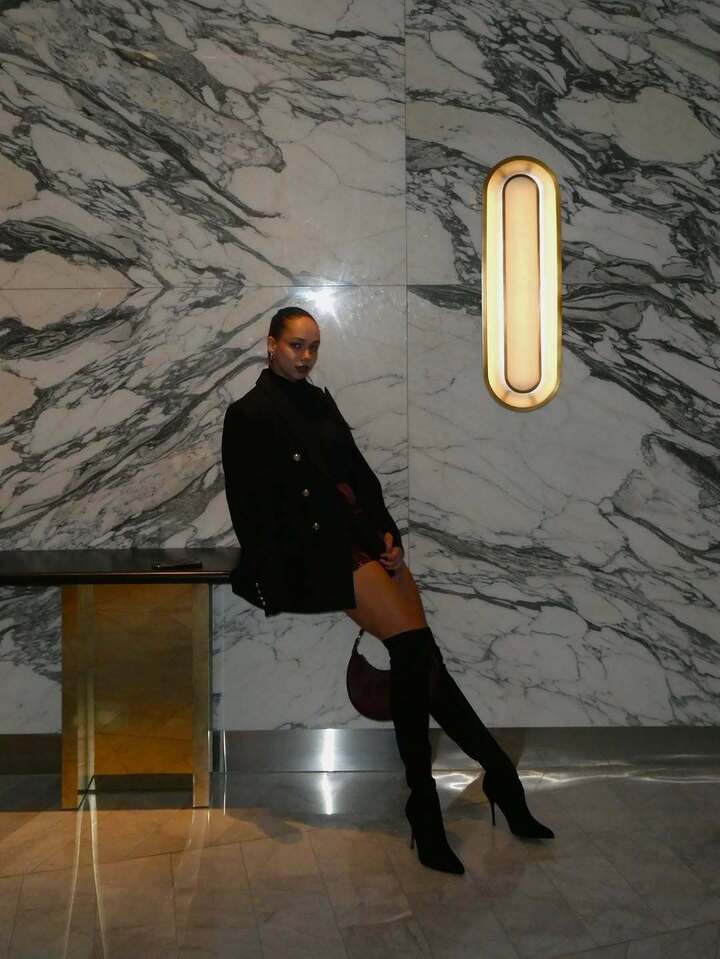 Анастасия обулась в высокие сапоги-чулки на тонкой шпильке. Свой образ известная спортсменка дополнила пиджаком-пальто и бордовой сумочкой.