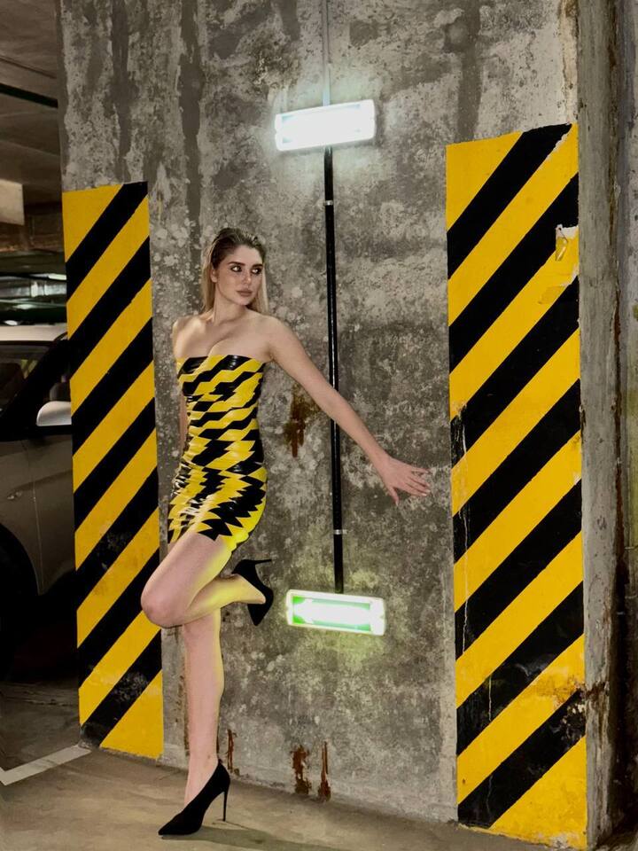 Съемка прошла на подземной парковке. Тищенко позировала на фоне бетонных стен с черно-желтой разметкой.
