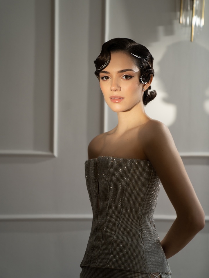 Но фото, появившемся в соцсетях, Евгения позирует в студии. На ней корсет из ткани с серебристыми нитями и такие же брюки со шнуровкой по бокам. Волосы уложены в затейливую прическу с завитками, украшенными жемчужными бусинами.