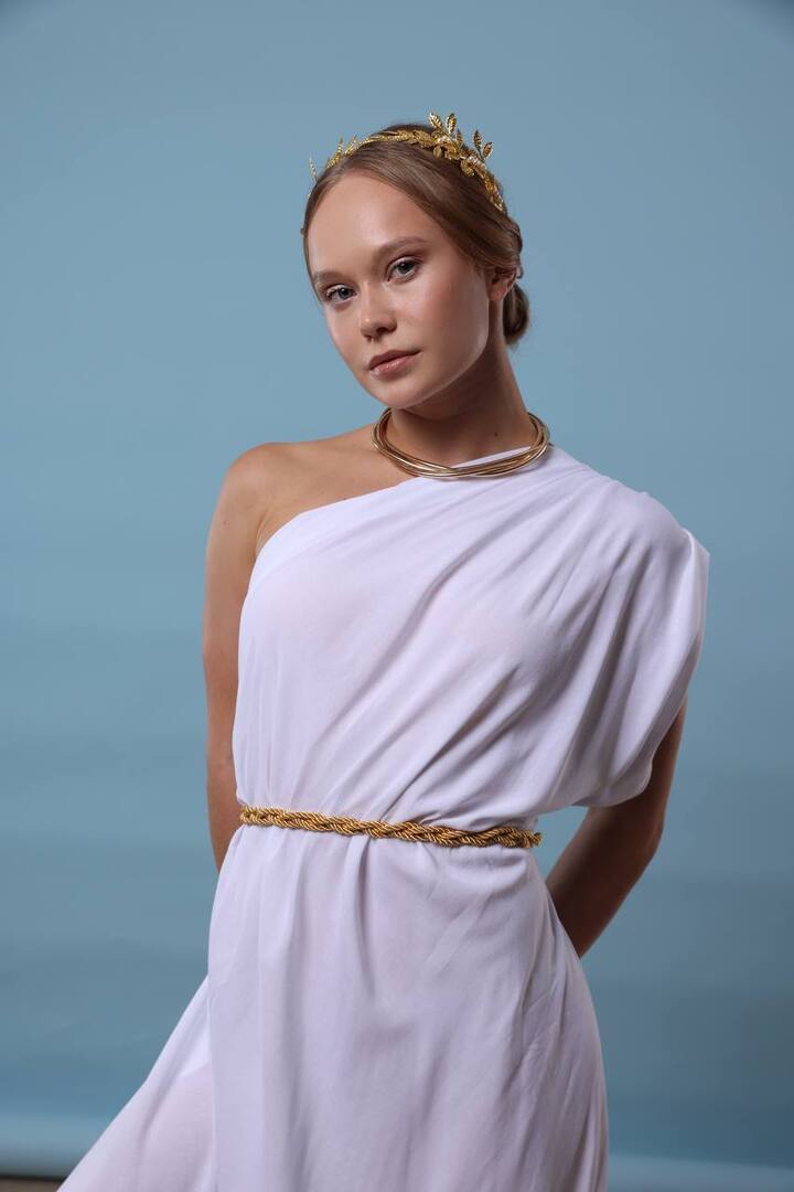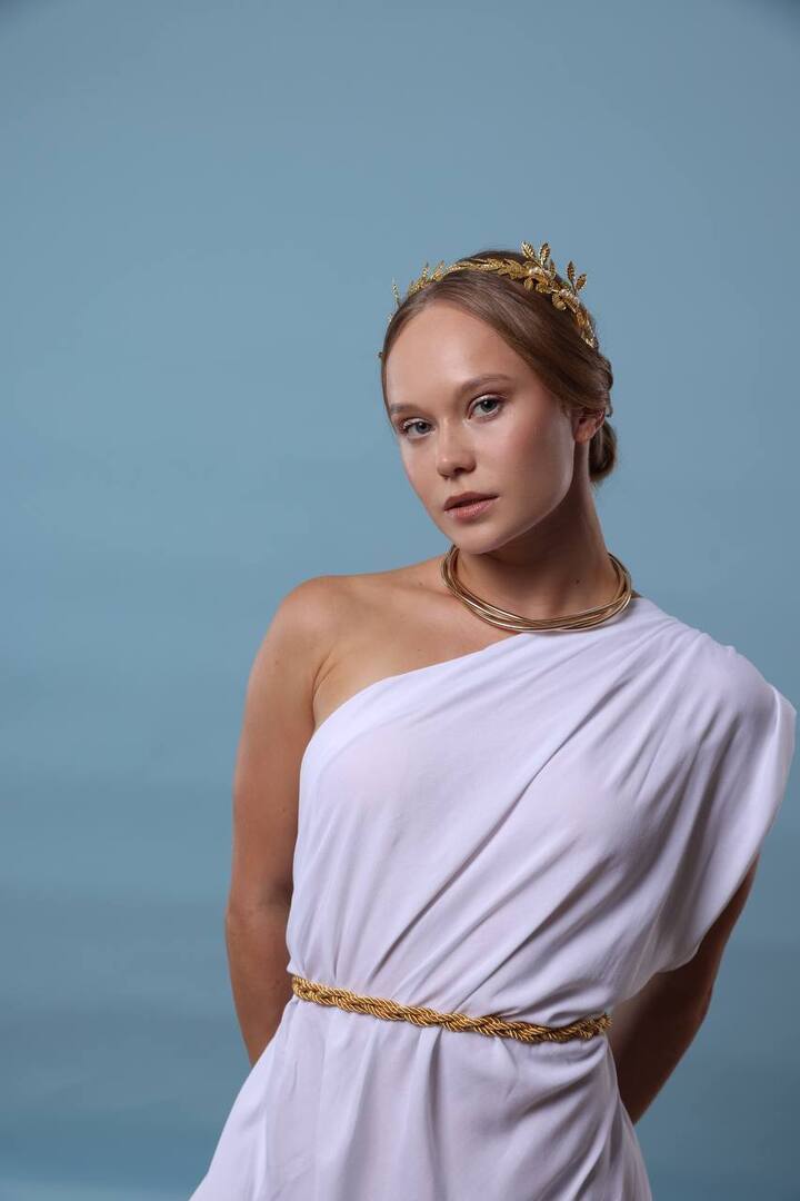 На этот раз преображение Ангелины было особенно удачным. Она оделась в белую тунику на одно плечо, подпоясав ее золотым плетеным поясом. К своему наряду спортсменка добавила золотое ожерелье и украсила голову золотым венком.