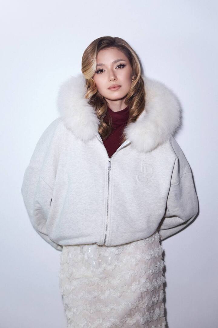 Второй образ получился более игривым и зимним. Камила облачилась в короткую белую юбку, украшенную пайетками и толстовку с мехом на капюшоне. К своему наряду фигуристка добавила черные босоножки на невысоком каблуке.