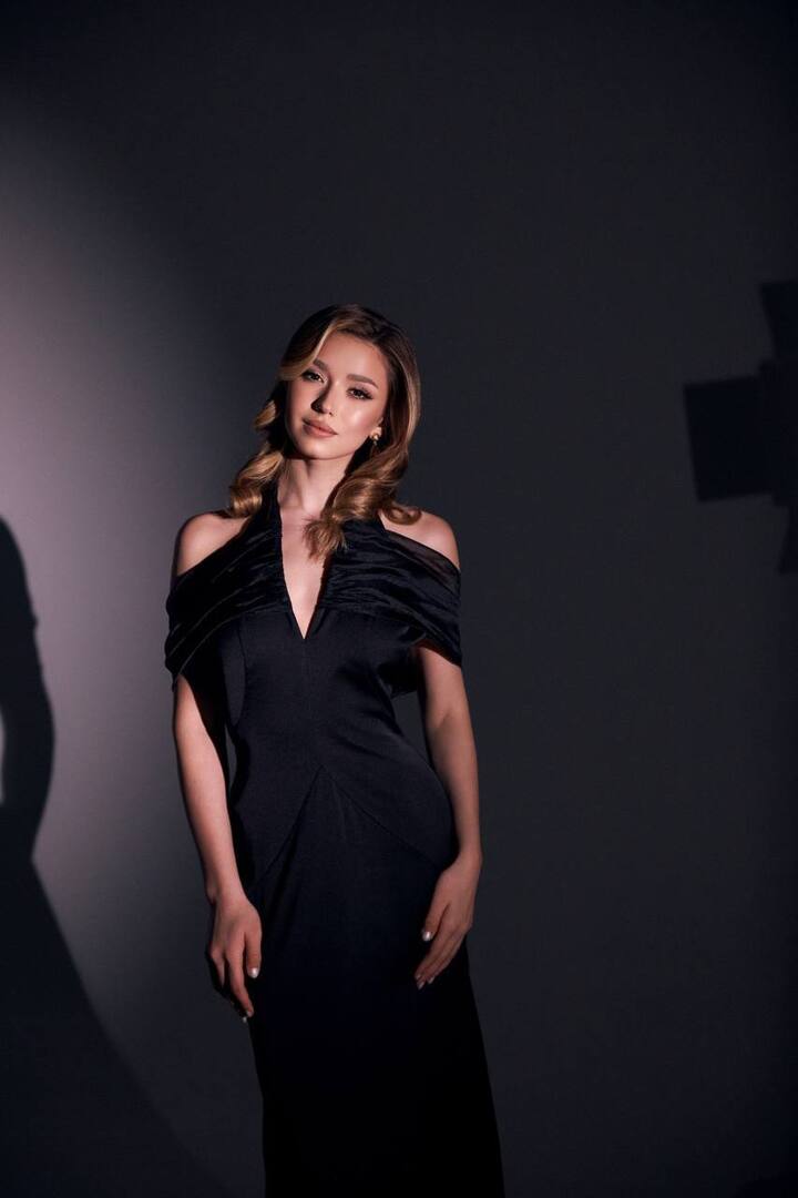 Для первого образа фигуристка оделась в длинное платье с голой спиной, открытыми плечами и глубоким вырезом на груди. Спортсменку сняли стоя в полный рост, а также со спины.