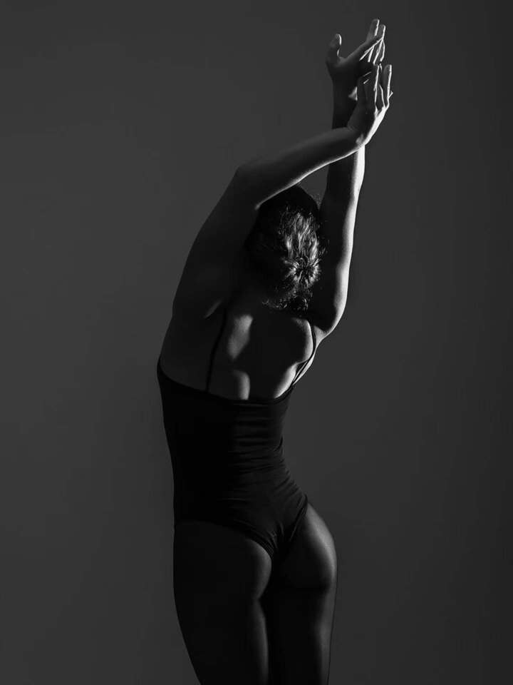 Прыгунья с вышки не стала долго думать над образом, она пришла на съемку в черном боди на тонких бретелях и полупрозрачных черных колготках. Елизавета аккуратно накрасилась и собрала волосы в низкий пучок.