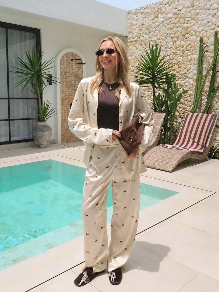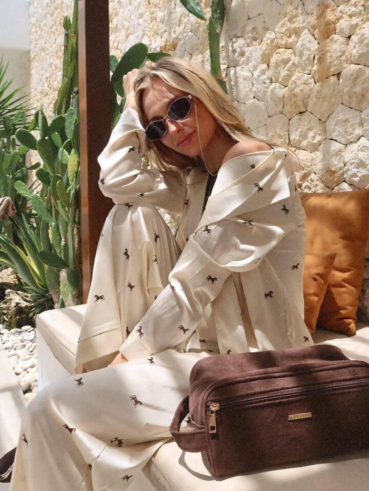 Изюминкой лука стал принт с лошадьми – символом наступившего 2026 года. Лошадки украшают как брюки и рубашку, так и обувь модницы-гимнастки.