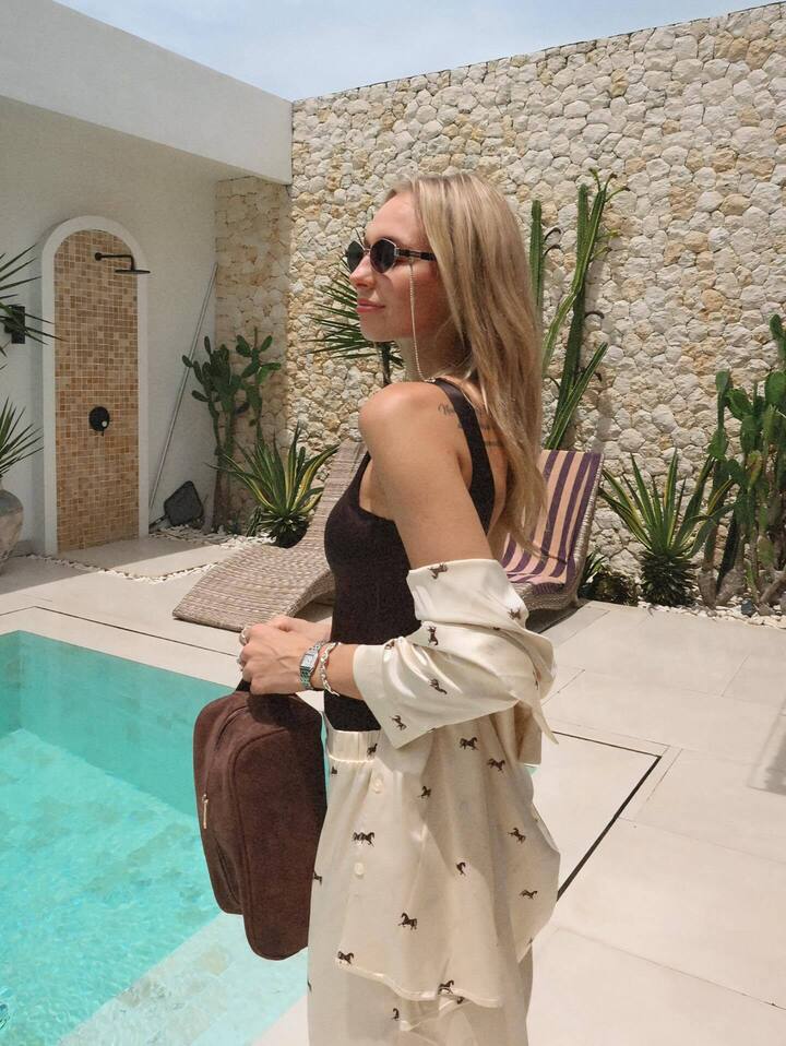 Свой курортный образ Дарья дополнила темно-коричневым боди, замшевой сумкой и солнцезащитными очками. Нагорная использовала украшения из белого металла, она добавила к наряду браслеты, часы, кольца, цепочку для очков и крестик на тонкой цепочке.